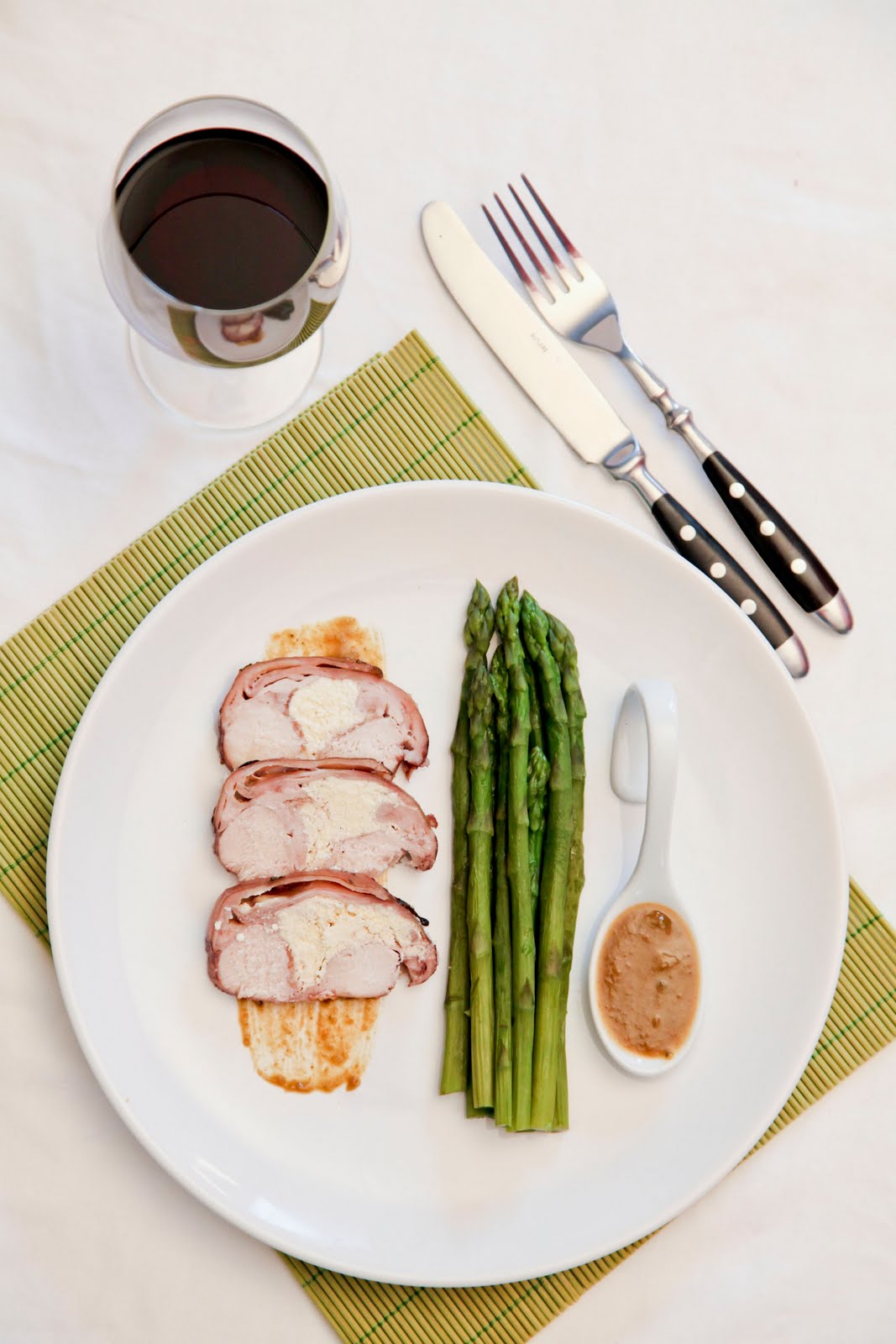 Tálaláshoz a húst óvatosan felszeleteljük, a mártást vékonyan a tányérra kenjük, ráhelyezzük a hús szeleteket, pici lágy extra szűz olívaolajat cseppentünk rá, mellé tesszük a spárgát, nagy szemű jó minőségű sóval (pl. Maldon, akár a füstölt is lehet) picit megszórjuk, egy adag mártást, külön tálban a tányéron mellé helyezünk.